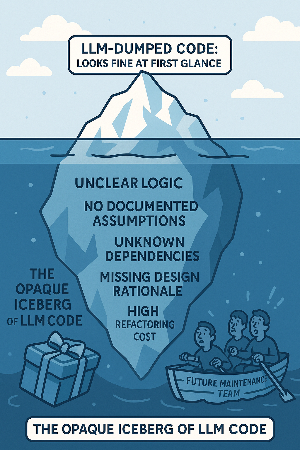 Future changes, bug fixes, performance boosts, or new features become a nightmare. Instead of extending a clear, well-understood system, you get stuck wrestling with a black box. Every change turns into a risky, time-consuming archaeological dig, trying to figure out the design that was never truly human-designed. This creates brittle code, a big reluctance to refactor, and eventually, a codebase that costs more and more to change and update. The initial “speed gain” from the LLM dump is quickly lost to huge, often unseen, long-term costs. It also kills a team’s confidence in being able to update and maintain the software. It’s like taking over a complex, undocumented machine – you can press the buttons, but you truly don’t know how to fix it when it breaks or make it do something new efficiently.
